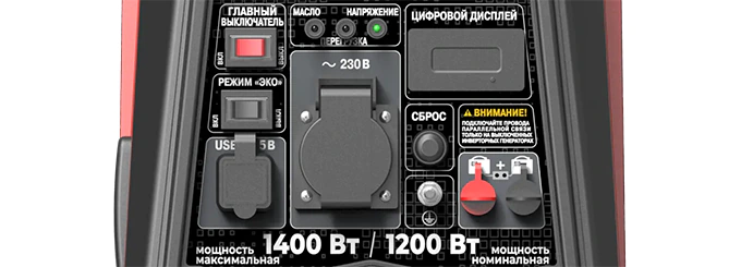 - ЖК-дисплей и световые индикаторы обеспечивают удобный контроль параметров и состояния генератора SUNREKA G1400iS.