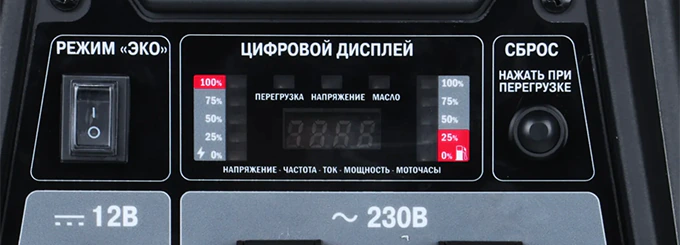 Встроенный цифровой дисплей обеспечивает постоянный контроль за состоянием генератора и своевременное техническое обслуживание. На экране отображаются основные параметры — напряжение, частота, моточасы. Индикаторы сигнализируют о перегрузке и низком уровне масла.