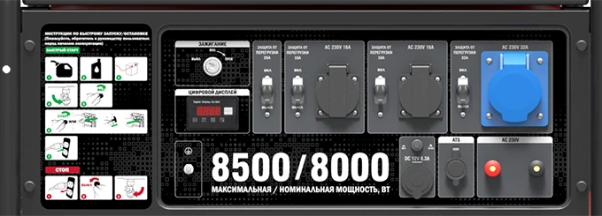 Генератор оборудован тремя розетками 230 В, включая силовую на 32 А, а также выходом постоянного тока 12 В для зарядки аккумуляторов или подключения автомобильных устройств. Такая конфигурация обеспечивает гибкость подключения бытовой техники и профессионального оборудования.