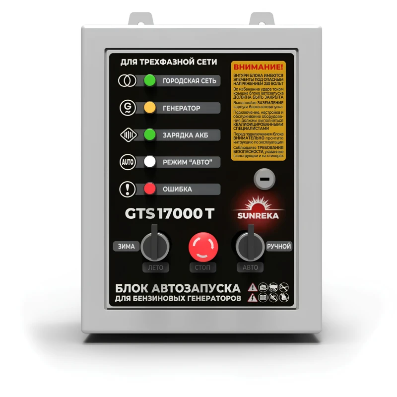 На передней панели размещены светодиодные индикаторы, отображающие текущий режим работы — «городская сеть» или «генератор», процесс зарядки АКБ, режим «Авто» или ошибку. Переключатель «лето/зима» позволяет адаптировать алгоритм работы под сезонные особенности. В холодное время при переключении в режим «зима» запускается предварительный прогрев двигателя. Устройство поддерживает как автоматический, так и ручной режим управления. Благодаря компактному корпусу и возможности настенного монтажа блок SUNREKA GTS17000T легко размещается в электрощитовой или на стене технического помещения без необходимости выделения отдельного пространства под его установку.